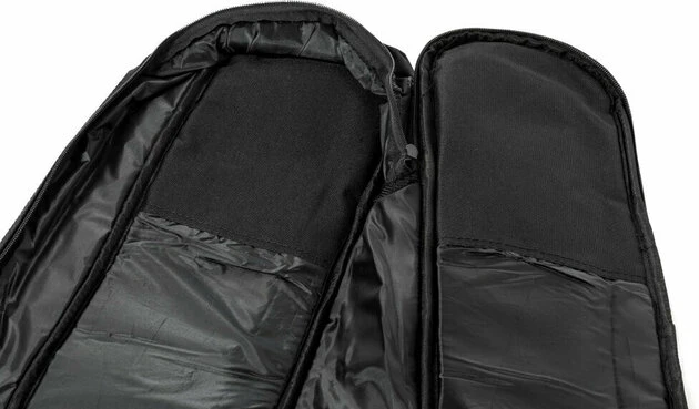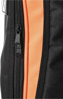 Soft gig bag for acoustic guitar in standard dreadnought shape from Color Line series, made from durable rip-proof nylon 1600D with 15 mm padding that provides great protection against mechanical damage and external influences. It is equipped with rubber feet for improved stability, two front pockets for accessories, and fixed handle with rubber holder on the side. Black and orange colour combination with Bespeco logo.