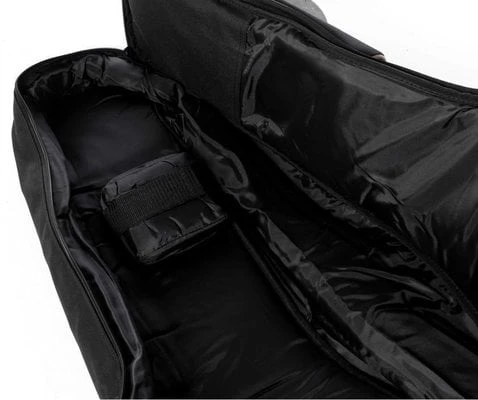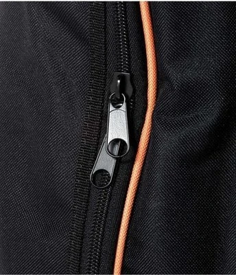 Soft gig bag for acoustic guitar with standard dreadnought body shape from Famous Line series, made of rip-proof 1800D nylon with 35 mm nylon padding that provides perfect protection against mechanical damage and external influences. It also features rubber feet for better stability, sturdy zippers, 3 front pockets for accessories and two padded handles (on the front and the side). Anthracite grey and orange colour combination.