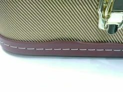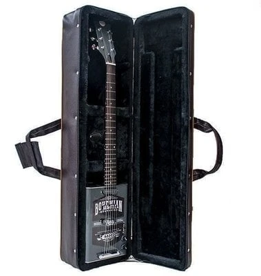Hard case for Oil Can Series Bohemian guitars. Protect your Bohemian Guitar with this custom hard case made specifically for your Boho. Brown Exterior, Black Stitching, Gold Piping, Black molded handle, Chrome clasps / locks, Gray plush interior, White screened logo.