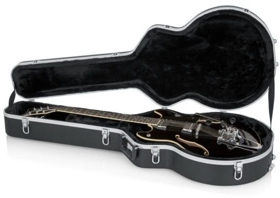 The GC-335 deluxe molded case is designed to fit Semi-Hollow Guitars. Lined with plush fabric and outfitted with an EPS foam core, the case contours to the shape of the guitar and provides support to all the most delicate areas. The outer shell is molded from ultra-resilient ABS plastic, a semi-flexible material able to absorb impacts and endure the abuse of travel. Heavy-duty aluminum edging ensures a tight fit while lockable latches let you secure the case quickly and easily. For semi-hollow acoustic guitars.