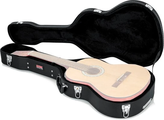 The GWE-CLASSIC Hard-Shell Wood Case for Classical Guitars is designed to protect against the minor bumps and bruises of daily use. Ultra-durable plywood coated in black Tolex PVC forms a moisture-resistant, impact-resistant outer barrier while plush fabric lining keeps your classical guitar held in place. The large interior storage compartment fits everything from straps and tuners to picks and capos. Chrome plated lockable latches form a secure enclosure and the ergonomic carrying handle perfectly balances the case’s weight and gives you a comfy grip on your gear. Keep your classical guitar safe and sound with the Gator GWE-CLASSIC hard-shell wood case.
