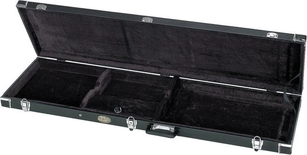 Universal sturdy flat-top wooden shell case for electric guitar from Economy series that features a matt black, shagreened imitation leather cover with elegant contrast stitching and black velvet interior padding. It is equipped with chrome plated locks with three lid hinges, sturdy synthetic handle and screw-attached rubber feet for better stability. There is also an accessory compartment within the lid.