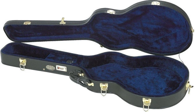 Sturdy arched-top wooden shell case for semi-acoustic guitar ES-335 from Prestige series that features a black, shagreened imitation leather cover with elegant contrast stitching and blue plush interior padding. It is equipped with gold-plated locks including one combination lock and two lid hinges, comfortable soft handle and 9 metal feet for incredible stability. There is also an accessory compartment within the lid and side metal loops for carrying strap (strap is not included).
