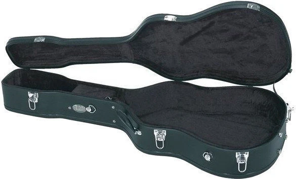 Sturdy arched-top wooden shell case for 12-string acoustic or electro-acoustic guitar with dreadnought body shape from Economy series that features a matt black, shagreened imitation leather cover with elegant contrast stitching and black plush interior padding. It is equipped with chrome plated locks with three lid hinges, sturdy synthetic handle and screw-attached rubber feet for better stability. There is also an accessory compartment within the lid and metal loops for carrying strap (strap is not included).