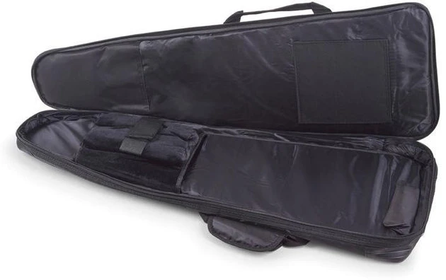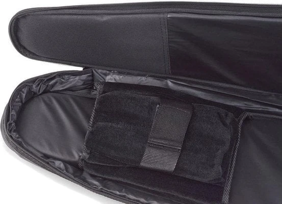 Durable gig bag from Deluxe Line series for Steinberger headless electric guitar that is made with solid water-resistant RokTex surface material with artificial leather applications, 20mm thick cushioning and extra-solid black nylon lining. It is equipped with the Guitar-Saving-System and Neck-Saving-System for ultimate protection, as well as extra protecting cushion for lower strap button and robust RokTex protection for mechanics and bridge. The gig bag has ergonomically formed and cushioned rear side, 8mm wide two-way zip wit nylon zip-hanger and printed RockBag logo, one 50mm wide cushioned backpack strap, one removable shoulder strap with metal carabiner hook and two cushioned carrier handles. It also provides one large outside pocket with zipper suitable for Worwei stand with integrated extra pocket, an extra pocket with zip at the front side of the neck and a window pocket for business cards. Other features include PVC-piping and PVC-strengthened bottom with metal feet, and metal hook for hanging the bag up. Black colour design.