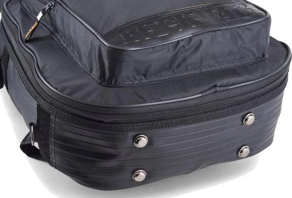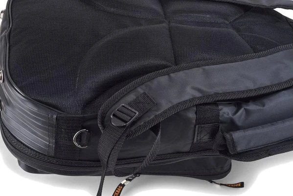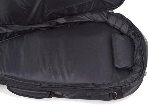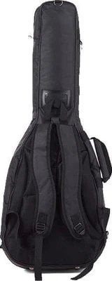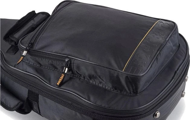 Durable gig bag from Deluxe Line series for 3/4-sized classical guitar that is made with solid water-resistant RokTex surface material with artificial leather applications, 20mm thick cushioning and extra-solid black nylon lining. It is equipped with the Guitar-Saving-System and Neck-Saving-System for ultimate protection, as well as extra protecting cushion for lower strap button and robust RokTex protection for mechanics and bridge. The gig bag has ergonomically formed and cushioned rear side, 8mm wide two-way zip wit nylon zip-hanger and printed RockBag logo, two 50mm wide cushioned backpack straps, one removable shoulder strap with metal carabiner hook and two cushioned carrier handles. It also provides one large outside pocket with zipper suitable for Worwei stand with integrated extra pocket, an extra pocket with zip at the front side of the neck and a window pocket for business cards. Other features include PVC-piping and PVC-strengthened bottom with metal feet, and metal hook for hanging the bag up. Black colour design.