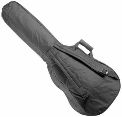 Gig bag for jumbo acoustic guitar from Economy series, made of hard black nylon with 10 mm foam padding. It has reinforced internal areas for strings and bridge, pocket for accessories, 2 shoulder straps that can be hidden directly into the bag, and textile reinforced handle.